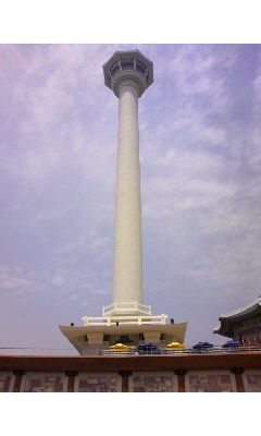 最後に行ったのは、釜山タワー。ろうそくみたいなタワーですね。見下ろした釜山の景色は造船場がちらほら。