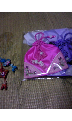韓国風袋、布キーホルダー、蓮の螺鈿(らでん)鏡、蝶の螺鈿鏡。
