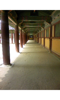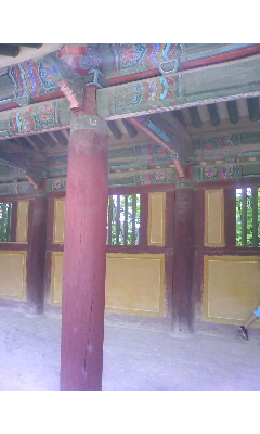 にしても、韓国の御寺は色彩鮮やかでした。おもに緑と赤を使用。写メの柱もこれで塗られていますね。ガイドさんに伺ったところ、この赤と緑は陰と陽を表しているということでした。柱の素材は赤松です。