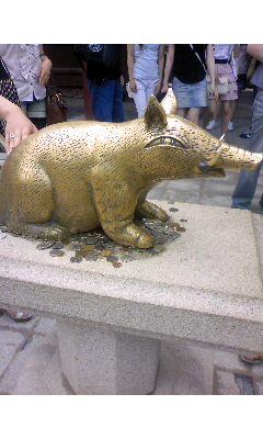 これは金色の豚です。何故、御寺に? 御本殿の屋根に豚の置物?が永い間誰にも気づかれずにあったらしいのですが、それが近年観光客が発見してネットでアップしたところたちどころに評判になったらしいです。屋根の豚を撮ろうとしたのですが、携帯では綺麗に撮れませんでした; 評判になった屋根の豚を耳にした観光客が此処にたくさん来るようになったので、この金色の豚を立てたようでした。