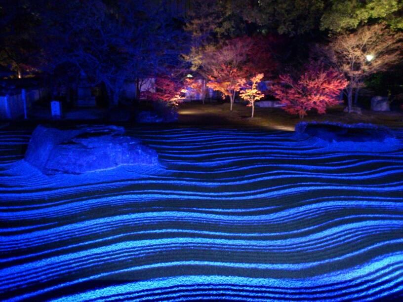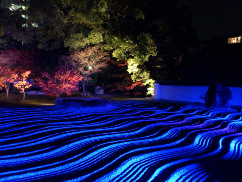 今年みたライトアップの中で一番綺麗でした。庭園の波打つ砂に時間経過で変化する光が照らされて…!静寂さを感じる光が品の良いものでお寺に相応しい。庭が龍安寺みたい。