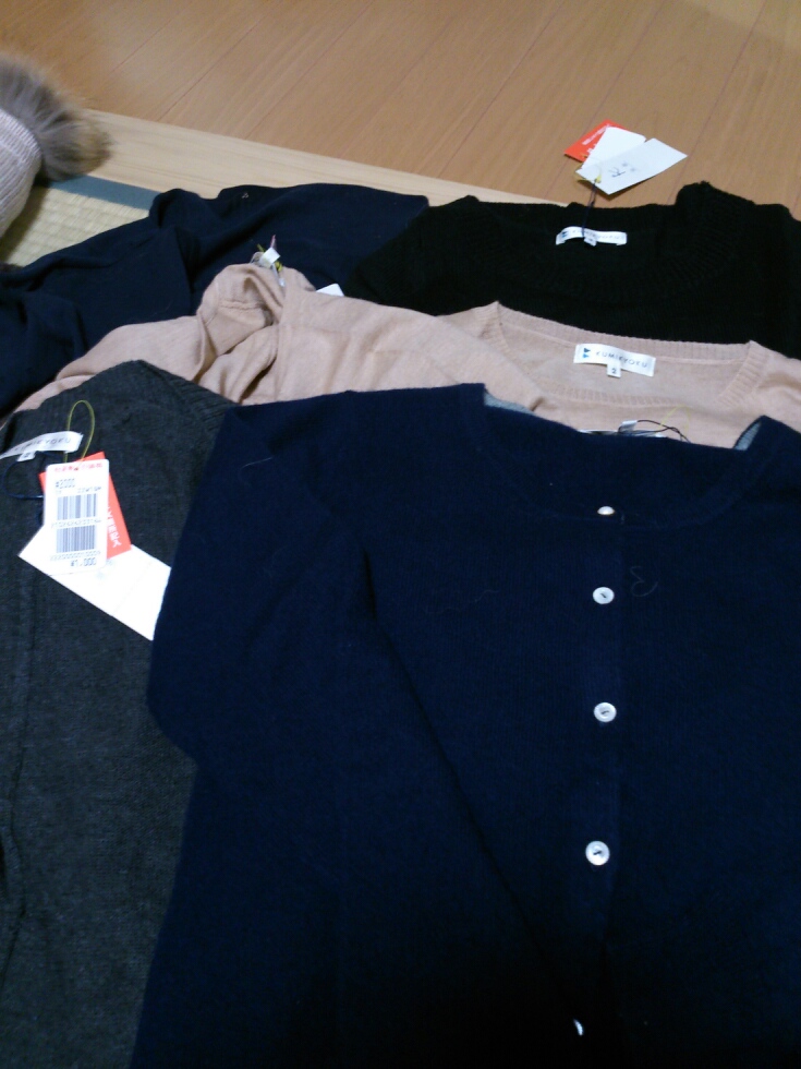 カシミアのカーディガン!( ・∇・) これは一番上のボタンだけ他のボタンと違うせいで、1000円。手触りが良い♪